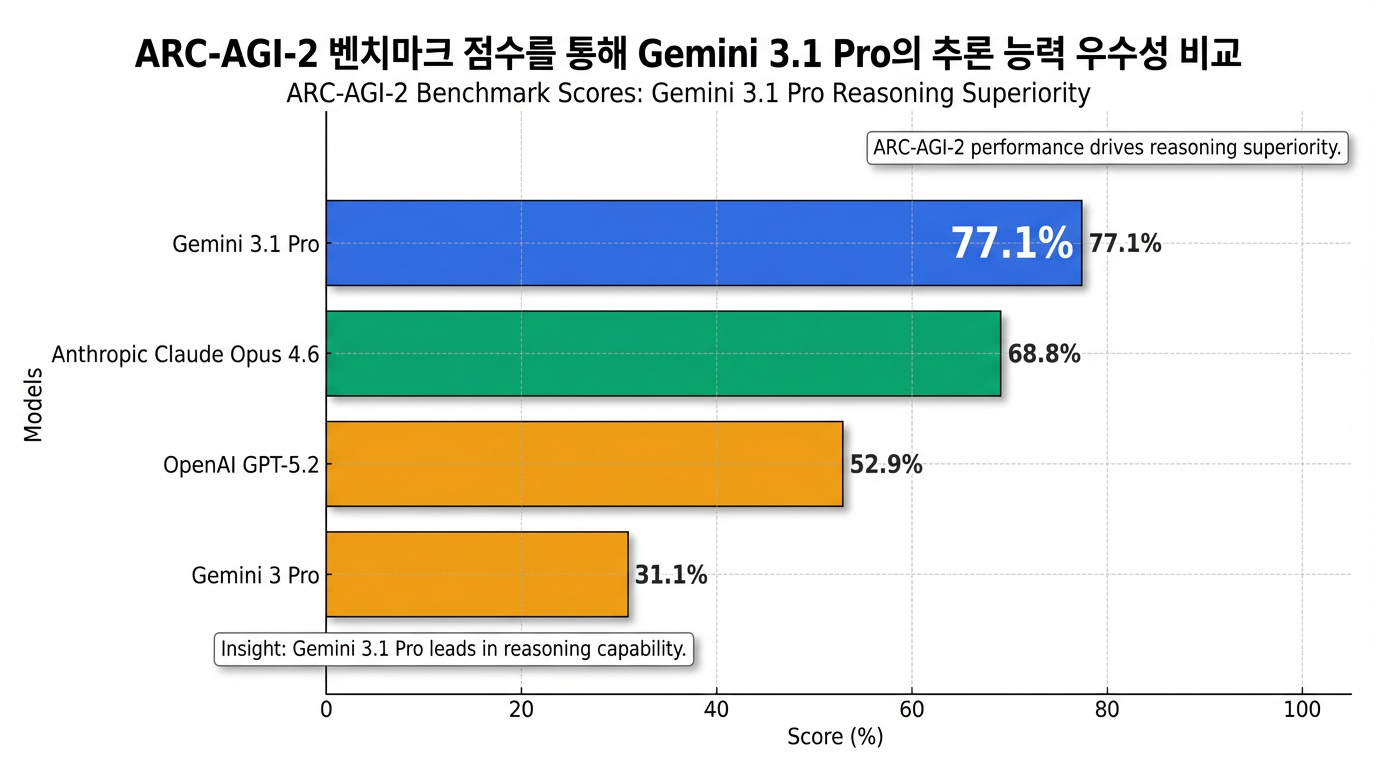 새로운 논리 패턴 해결 능력을 평가하는 ARC-AGI-2 벤치마크에서 77.1%의 검증 점수를 달성하며 이전 Gemini 3 Pro의 31.1%를 2배 이상 뛰어넘었습니다 2. 이는 경쟁 모델인 OpenAI GPT-5.2(52.9%) 및 Anthropic Claude Opus 4.6(68.8%)보다 높은 수치로, 추론 영역에서의 강력한 존재감을 입증했습니다 9.