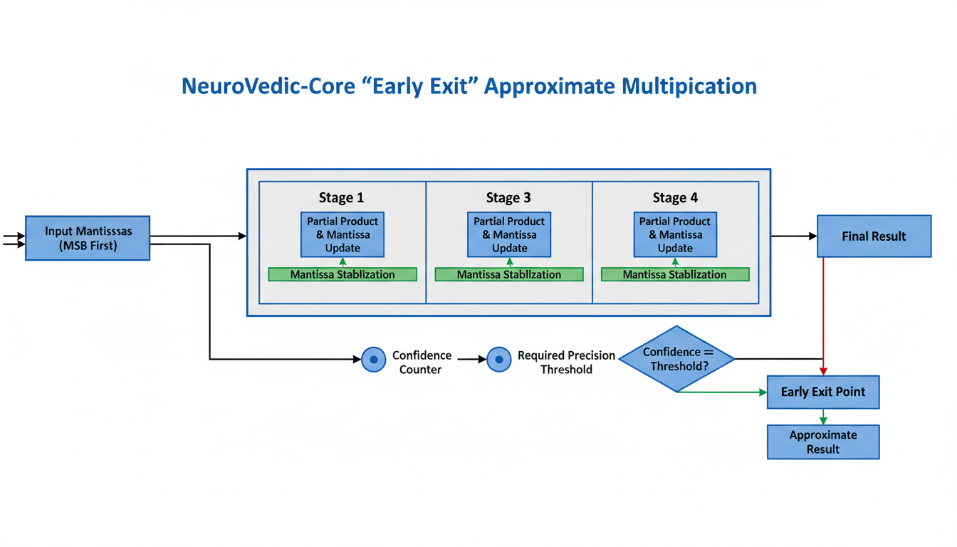 NeuroVedic-Core introduces a novel AI-specific optimization known as the "Early Exit" strategy, designed to enhance the efficiency of approximate multiplication. This strategy is particularly beneficial for neural network training, especially during the forward pass, where achieving full precision is often not a critical requirement.