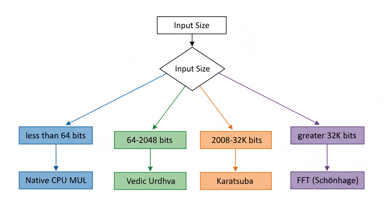 The dynamic selection process is governed by carefully defined thresholds, ensuring that the library always employs the asymptotically fastest and practically most efficient algorithm for the given input. The primary algorithms integrated into this strategy include native CPU multiplication, the Vedic Urdhva method (enhanced with AVX-512), Karatsuba's algorithm, and FFT-based multiplication (specifically Schönhage-Strassen).