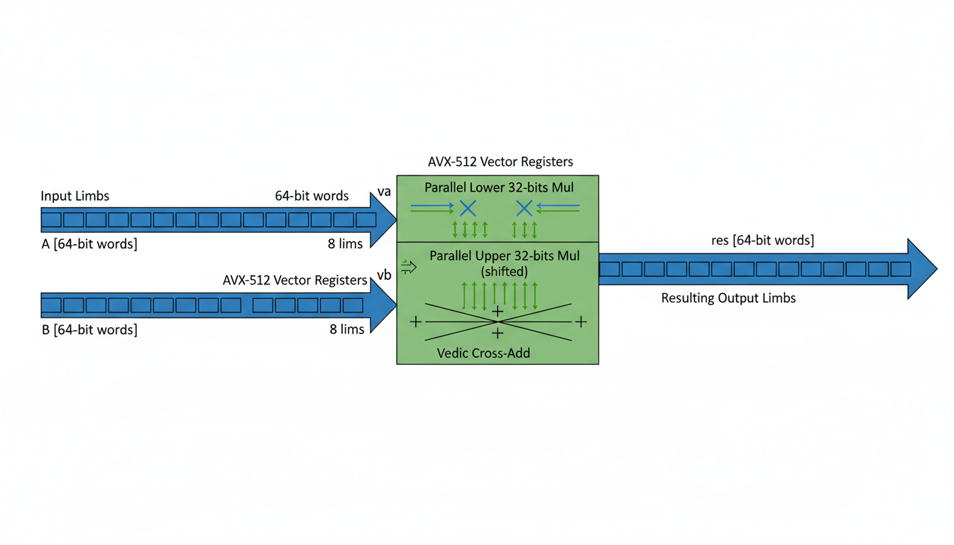 Vedic Cross-Add Logic: The partial products from the lower and upper 32-bit multiplications are combined. The _mm512_add_epi64 instruction performs a parallel addition of these results. While the provided snippet simplifies the carry handling, in a complete implementation, this "cross-add" step would intricately manage carries across the 64-bit limbs, emulating the diagonal and vertical summation of the Urdhva Tiryakbhyam method.