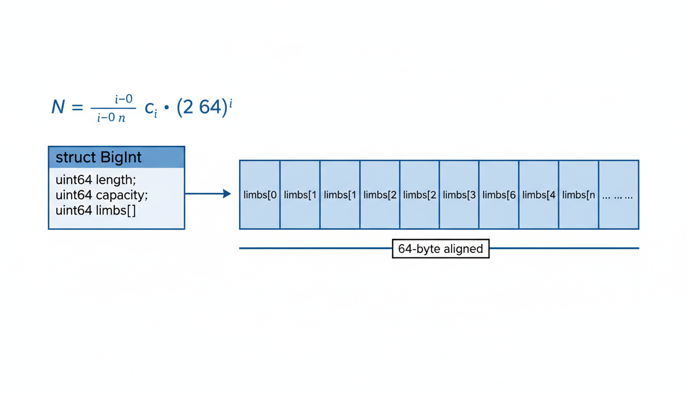 To ensure optimal performance, particularly by minimizing L1/L2 cache misses, the memory layout for these large integers is meticulously optimized for contiguity. The BigInt struct facilitates this, containing metadata such as length (the number of active 64-bit limbs) and capacity (the total allocated memory), alongside a Flexible Array Member limbs that holds the actual 64-bit integer parts contiguously in memory.