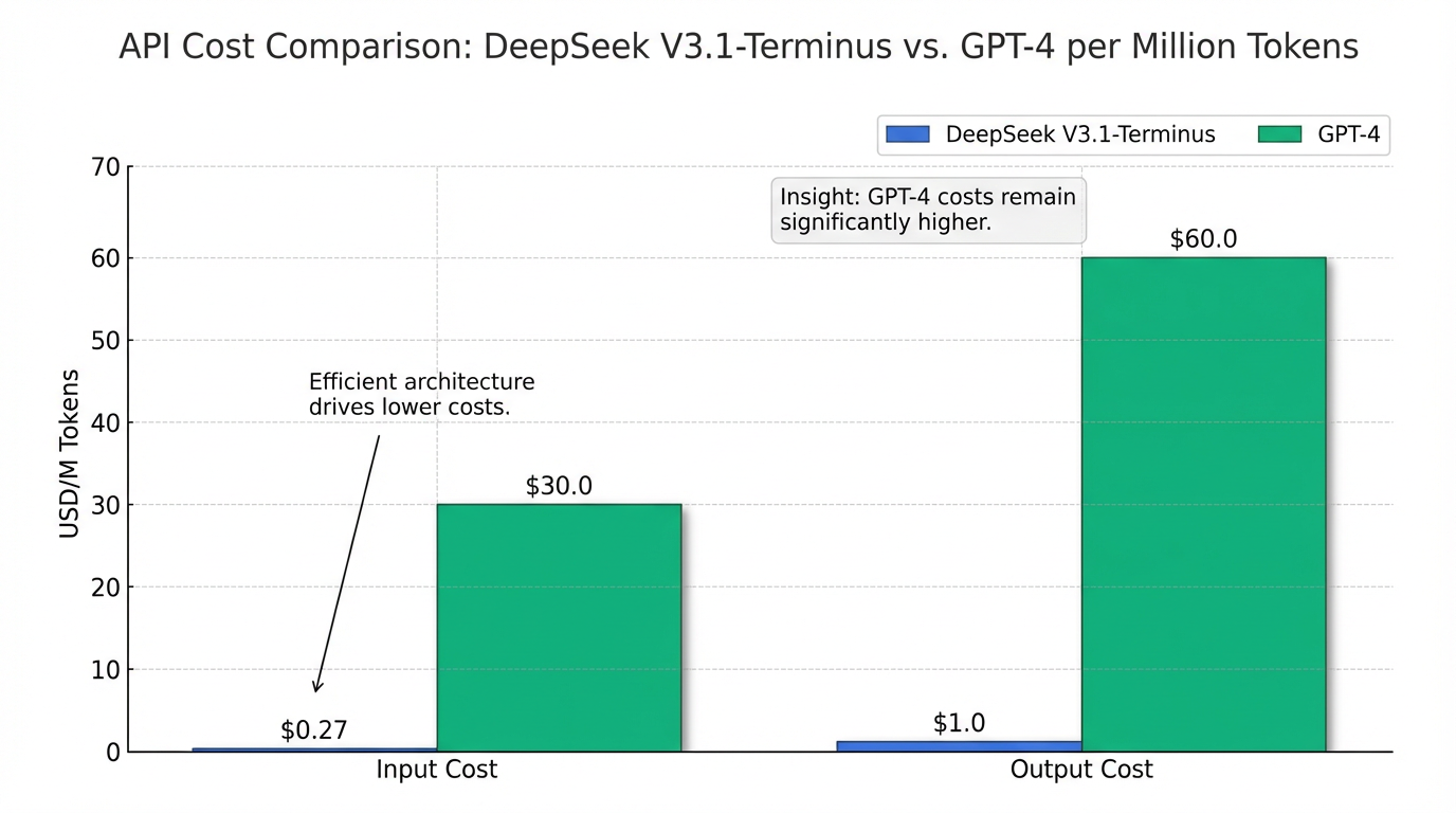 Los costos de la API de DeepSeek V3.1-Terminus son notablemente bajos, con aproximadamente $0,27 por millón de tokens de entrada y $1,0 por millón de tokens de salida para su versión serverless . Esto contrasta fuertemente con los costos de GPT-4, que alcanzan los $30,00 de entrada y $60,00 de salida por millón de tokens 13.