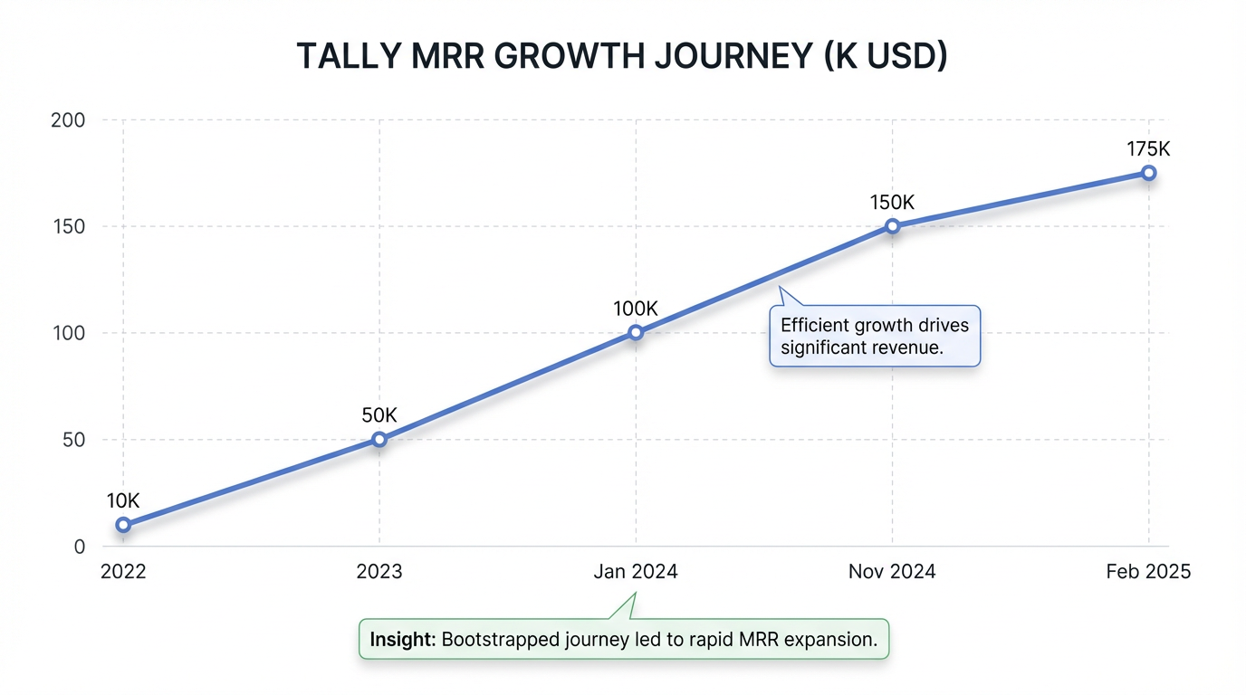 Tally achieved its first $10K MRR month in 2022, growing to $50K MRR in 2023 with a team of six 6. This impressive trajectory continued, crossing $100K MRR in January 2024, reaching $150K MRR by November 2024, and ultimately hitting $175K MRR by February 2025 6. This growth was accomplished with a lean team, starting with just two founders and expanding to eight people by early 2025 6. Their zero-dollar ad budget and low operational costs—typically around 30% of revenue—underscore the remarkable efficiency of their product-led and community-driven approach 6.