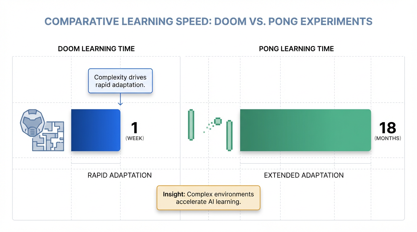 Doom is much more complex, requiring 3D navigation, aiming, and combat decisions . Pong involved simpler, direct input-output correlations .