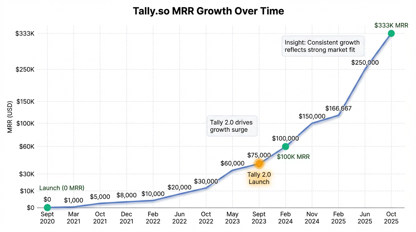 Their commitment to these principles has translated into impressive, transparently documented growth. Starting from $0 MRR in September 2020, Tally quickly gained traction, reaching $10,000 MRR by February 2022 1. By September 2023, coinciding with the launch of Tally 2.0, they hit $75,000 MRR, further accelerating to $100,000 MRR by February 2024 1. The latter part of their journey saw an even steeper incline, projecting $2 million ARR by February 2025, and an impressive $4 million ARR by October 2025, demonstrating the power of their bootstrapped approach 1.