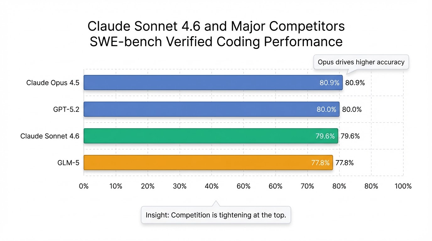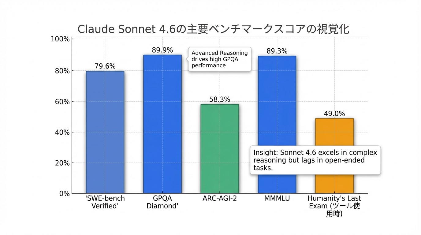 AnthropicはSonnet 4.6の性能向上をベンチマークで示しており、OSWorldベンチマークでは人間のベースラインに匹敵するスコアを達成し、歴代のSonnetモデルで最高スコアを記録しました 3。また、SWE-bench Verifiedでは79.6%を記録し 8、Agentic Financial AnalysisやOffice tasksといった一部の「経済的価値を持つ実務タスク」では、最上位モデルであるClaude Opus 4.6やGoogleのGemini 3 Pro、OpenAIのGPT 5.2を上回る性能を示したケースも報告されています 8。