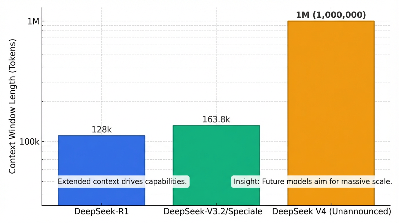 しかしながら、多くの関心を集める100万トークンのコンテキストウィンドウについては、現在リリースされているDeepSeekのモデルでは確認されておらず2、DeepSeek-V3.2およびDeepSeek-V3.2-Specialeのコンテキストウィンドウは163.8Kトークンです2。100万トークンを超えるコンテキストウィンドウは、**2026年2月にリリースが予想される未発表の「DeepSeek V4」**で導入されると噂されています3
