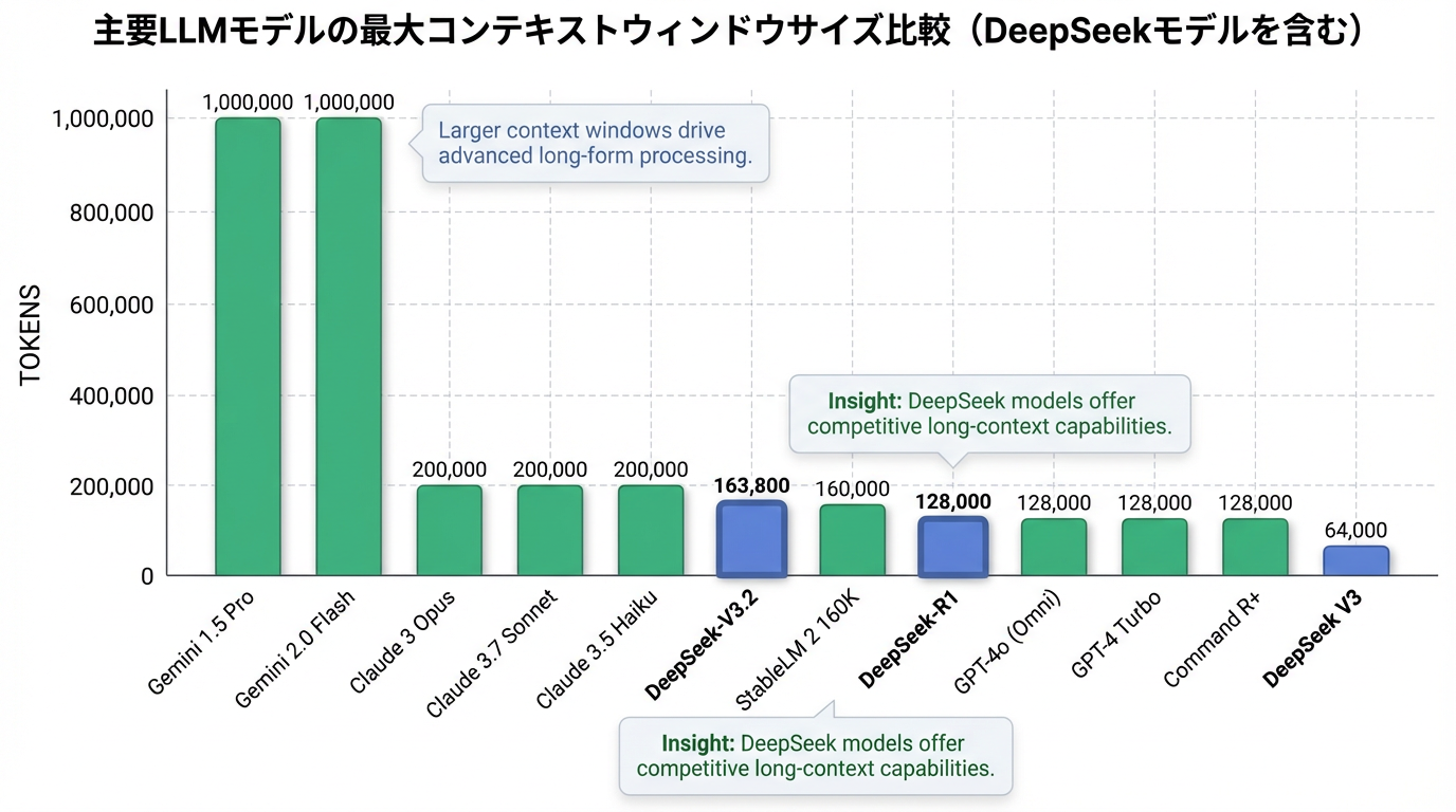 1. DeepSeek-V3.2における100万トークンコンテキストの現状とDeepSeekモデルのコンテキストウィンドウ