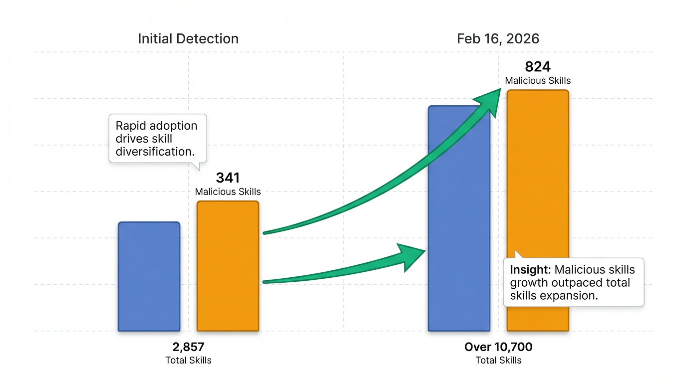 Esta campaña, rastreada como ClawHavoc, orquestaba que las habilidades instaran a los usuarios a descargar y ejecutar binarios maliciosos, a menudo variantes de la temida familia de 'infostealers' Atomic Stealer . El objetivo: robar credenciales, cookies, datos de autocompletado, tokens de acceso y claves API, con un especial interés en las cuentas de criptomonedas . La magnitud del ataque fue asombrosa: inicialmente se identificaron 341 entradas maliciosas de 2.857 habilidades, pero para el 16 de febrero de 2026, el número de habilidades maliciosas confirmadas ya superaba las 824 de un registro de más de 10.700 4.