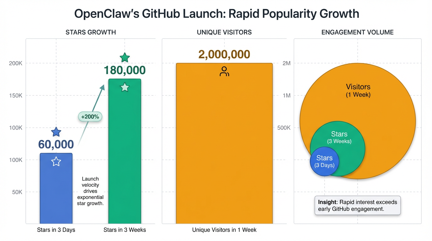 OpenClaw experimentó un ascenso meteórico, convirtiéndose en uno de los repositorios de GitHub de más rápido crecimiento, superando las 60.000 estrellas a los tres días de su lanzamiento público (26 de enero de 2026) y más de 180.000 estrellas en tres semanas, atrayendo a más de dos millones de visitantes en una sola semana .