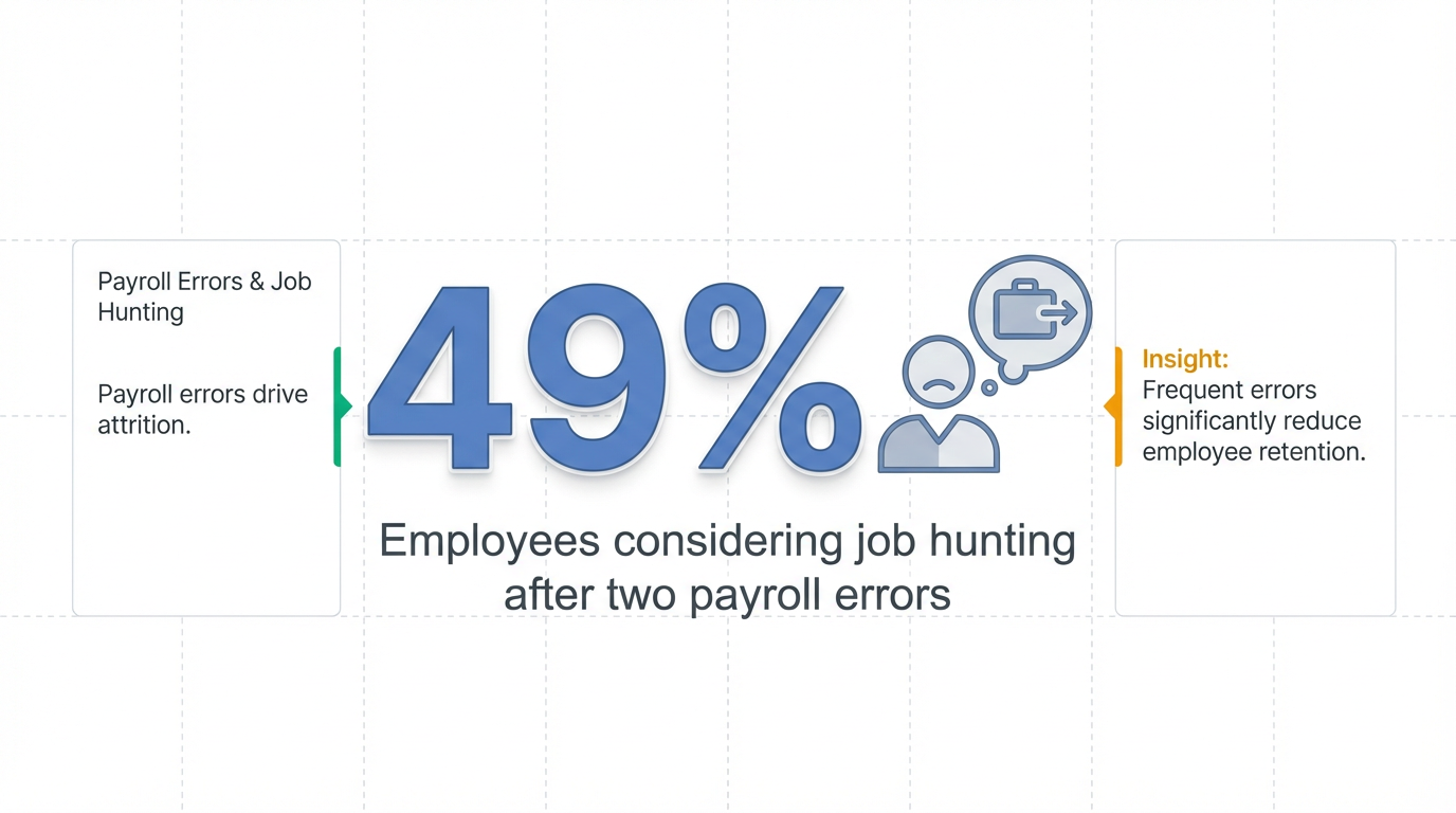 Disconnected HR, timekeeping, and payroll systems force manual data entry, escalating error rates and compromising data integrity across departments . Ultimately, payroll errors deeply impact employee well-being, causing increased stress, money concerns, and reduced productivity . Critically, such mistakes erode trust and can lead to high turnover, with 49% of employees considering job hunting after just two payroll errors .