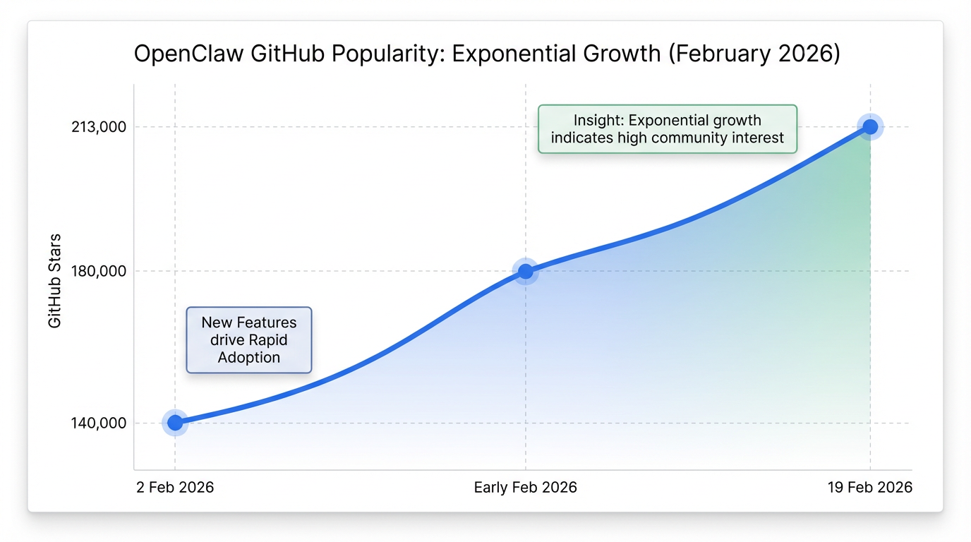 La popularité d'OpenClaw a connu une ascension fulgurante fin janvier 2026, notamment grâce au succès viral du projet Moltbook, un réseau social dédié aux agents IA 2. Le projet open-source a atteint plus de 180 000 étoiles début février, et plus de 213 000 étoiles d'ici le 19 février 2026, s'établissant comme l'un des projets open-source à la croissance la plus rapide de l'histoire de GitHub . Cette notoriété s'est étendue jusqu'à des entreprises de la Silicon Valley et de Chine 2, et a même généré un "buzz" tel que Cloudflare a lancé un service dédié, entraînant une hausse de 20% de ses actions 6. L'attrait principal réside dans sa nature open-source, sa flexibilité, et sa capacité à transformer de simples chatbots en de véritables "agents qui agissent" .