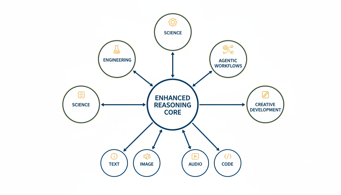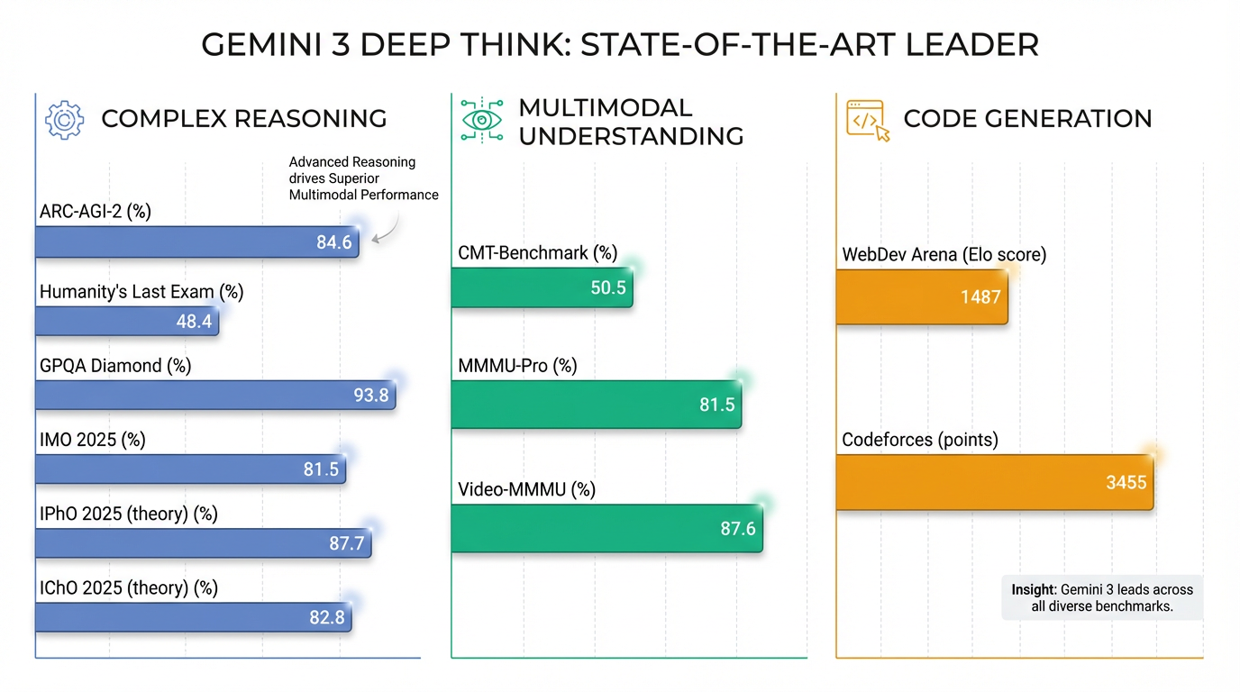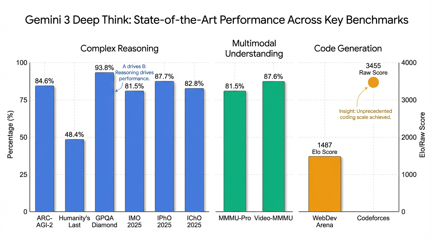 Deep Think's robust performance is evident across multiple demanding domains, powered by its specialized reasoning mode and native multimodal foundation.