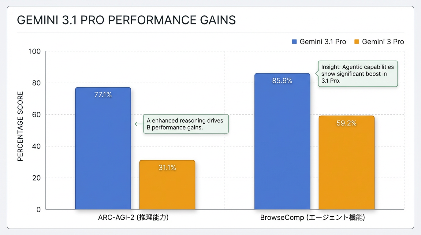 まず、ベンチマーク結果からは、Gemini 3.1 Proの推論能力とエージェント機能の飛躍的な向上が明確に示されています。未知の論理パターンを解く能力を評価する「ARC-AGI-2」ベンチマークにおいて、Gemini 3.1 Proは77.1%という高スコアを記録しました 4。これは、前モデルであるGemini 3 Proの31.1%と比較して2倍以上の性能向上であり、複雑な問題解決や抽象的な思考を要するタスクにおいて、AIが圧倒的な力を発揮することを示唆しています 4。