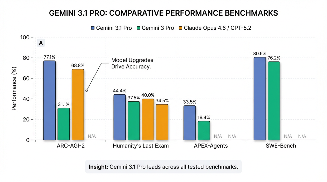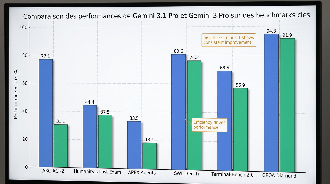 En termes de performances, Gemini 3.1 Pro démontre une supériorité notable, particulièrement dans les tâches exigeant un raisonnement avancé. Il a plus que doublé les performances de Gemini 3 Pro sur le benchmark ARC-AGI-2 pour la résolution de puzzles de logique inédits, atteignant 77,1 % contre 31,1 % . Il surpasse également Claude Opus 4.6 (68,8 %) sur ce même test . Sur le benchmark "Humanity's Last Exam" (raisonnement académique), il obtient 44,4 %, dépassant Gemini 3 Pro (37,5 %), Claude Opus 4.6 (40,0 %) et GPT-5.2 (34,5 %) . Ses améliorations pour les tâches agentiques et de codage sont également significatives, avec un score de 33,5 % sur APEX-Agents (82 % d'amélioration par rapport à Gemini 3 Pro) et 80,6 % sur SWE-Bench pour la correction de bugs .