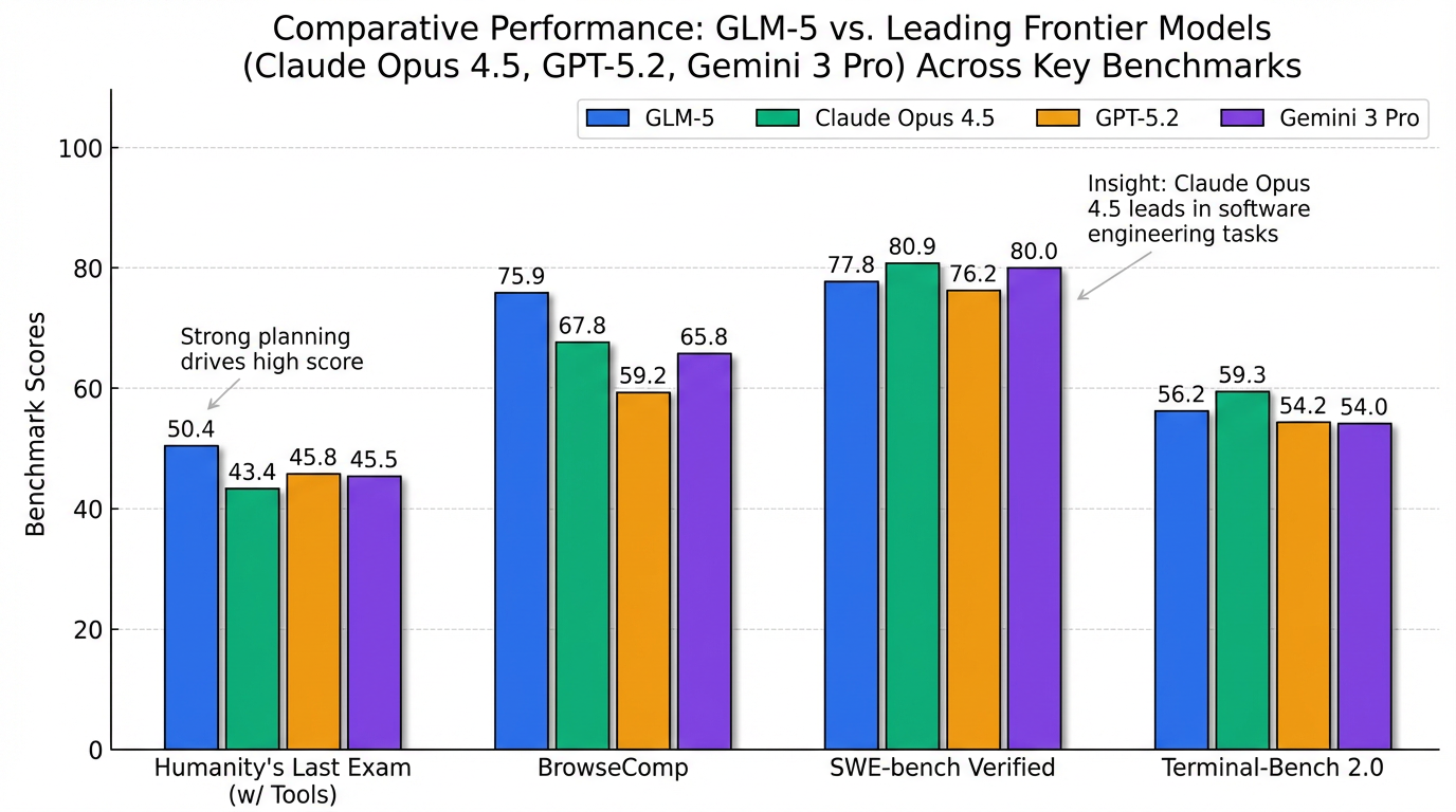 | Benchmark | GLM-5 | Claude Opus 4.5 | GPT-5.2 | Gemini 3 Pro |