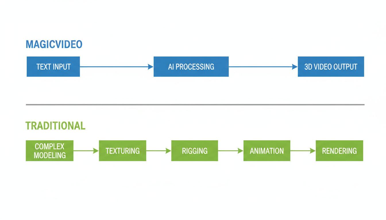 基于对日本AI视频生成及3D内容创作市场的审视,MagicVideo的“一键文字转3D视频”功能展现出以下核心差异化卖点: