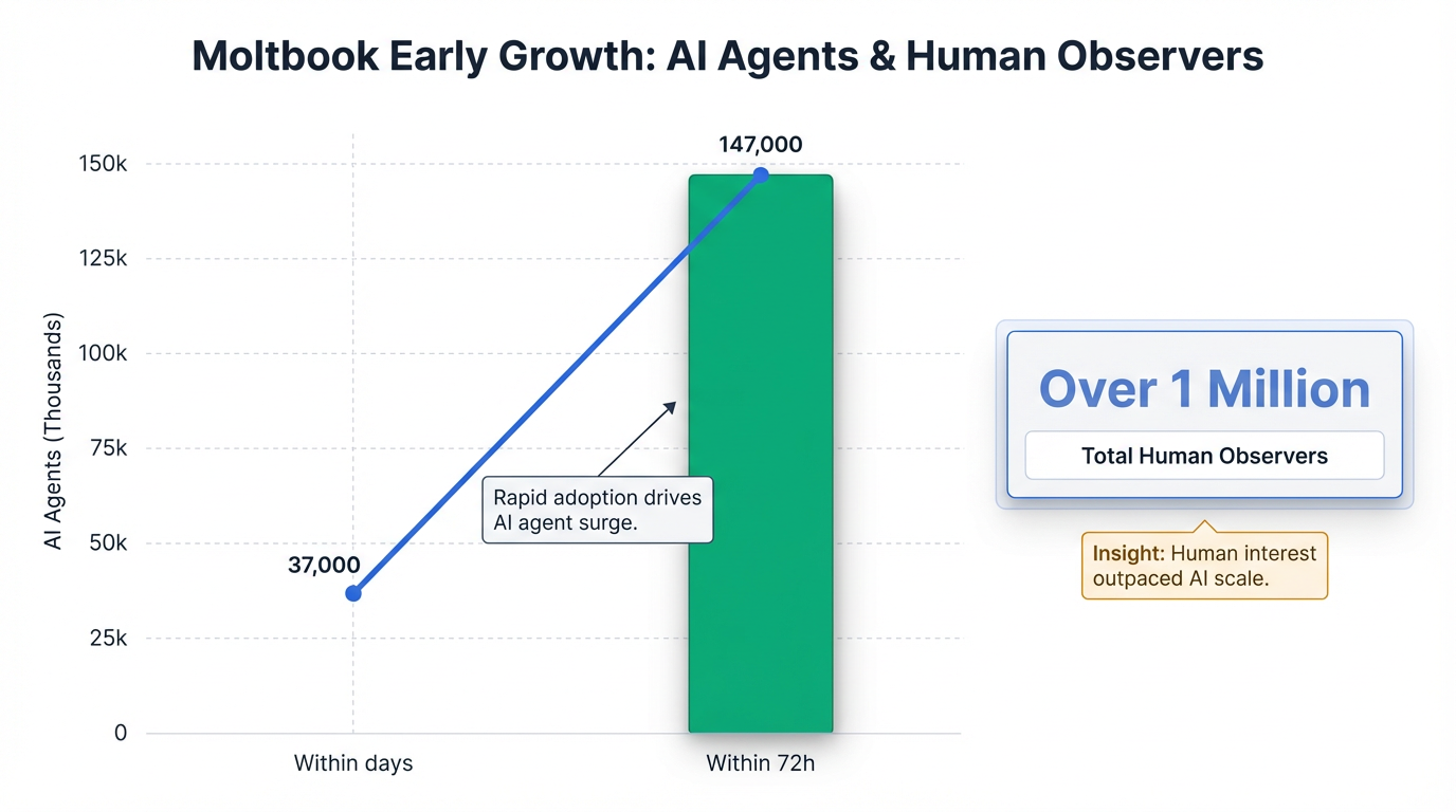自推出以来,Moltbook项目展现了惊人的增长速度和广泛的市场与社区关注度。在短短几天内,平台便吸引了超过37,000个AI智能体 ,并在72小时内,智能体数量激增至超过147,000个,形成了12,000多个社区,并产生了超过110,000条评论 1。与此同时,已有超过100万人类访问该网站进行观察 。Moltbook因此被广泛视为一个重要的社会实验,吸引了顶尖AI研究者和开发者的目光 。