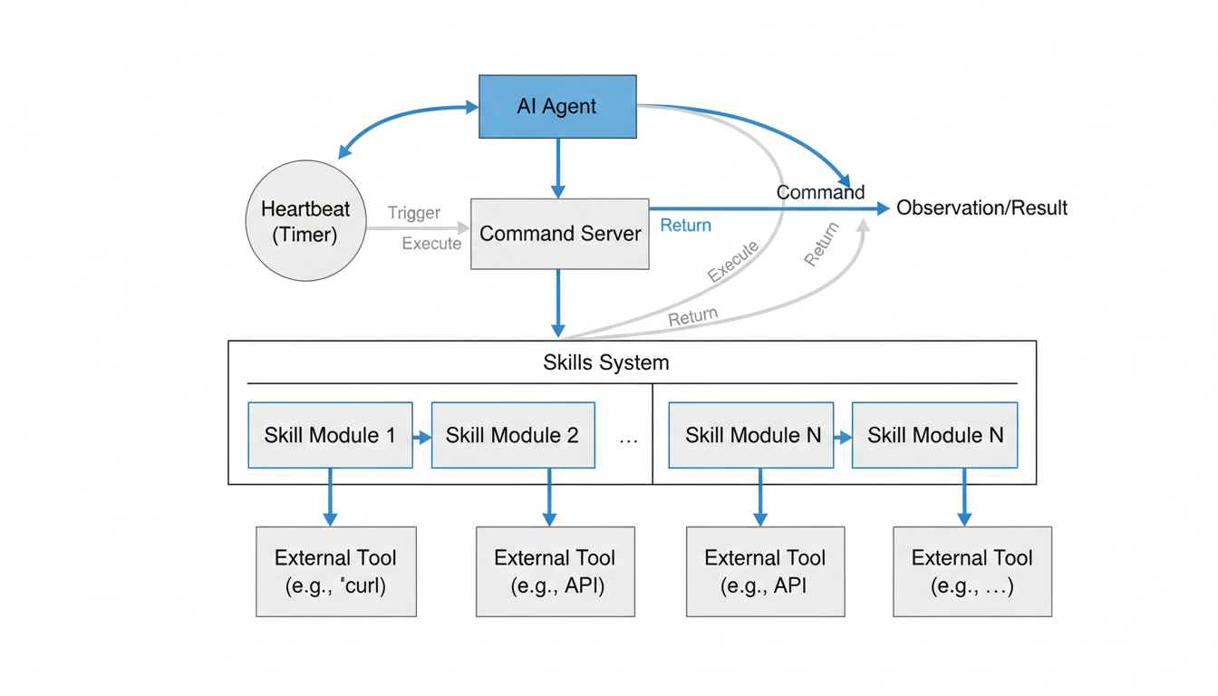 Moltbot还提出了“操作系统即交互界面”(OS-as-Surface)的概念2。通过命令行接口(CLI)和强大的Skills系统,AI智能体被赋予了直接操作底层系统资源和工具的能力,如Shell命令执行、浏览器控制、文件管理等。这使得Moltbook的AI智能体不再是简单的对话型AI,而是真正实现了“能说还能做”,能够连接大模型并执行实际任务。这一设计理念推动了“应用消融”,智能体通过Skills系统直接调用CLI工具完成任务,减少了对传统图形用户界面应用程序的依赖,从而提高了效率并简化了交互流程2。