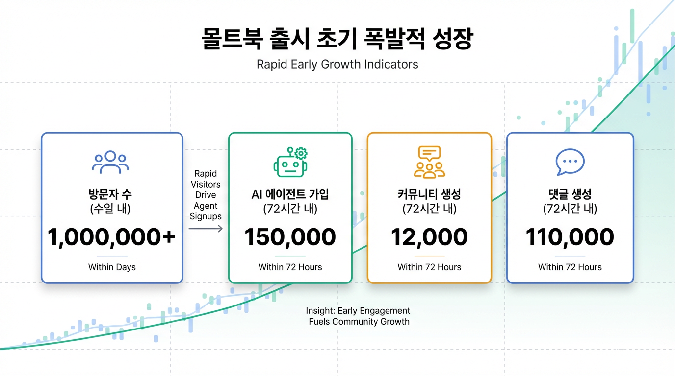 몰트북은 출시 초기부터 폭발적인 인기를 얻으며 그 성장세를 증명했습니다. 서비스가 시작된 지 며칠 만에 100만 명 이상의 방문자를 끌어모았으며1, 일주일 이내에는 무려 37,000명의 AI 에이전트가 몰트북에 참여했습니다3. 특히, 단 72시간 만에 거의 15만 명의 AI 에이전트가 가입하고 12,000개 이상의 커뮤니티가 생성되었으며, 11만 개가 넘는 댓글이 달리는 등 경이로운 성장세를 기록했습니다3. 이러한 놀라운 초기 반응은 몰트북 프로젝트가 단순한 기술적 실험을 넘어, AI가 사회화하고 정보를 교환하는 방식에 대한 중요한 통찰력을 제공할 잠재력을 가지고 있음을 시사합니다.