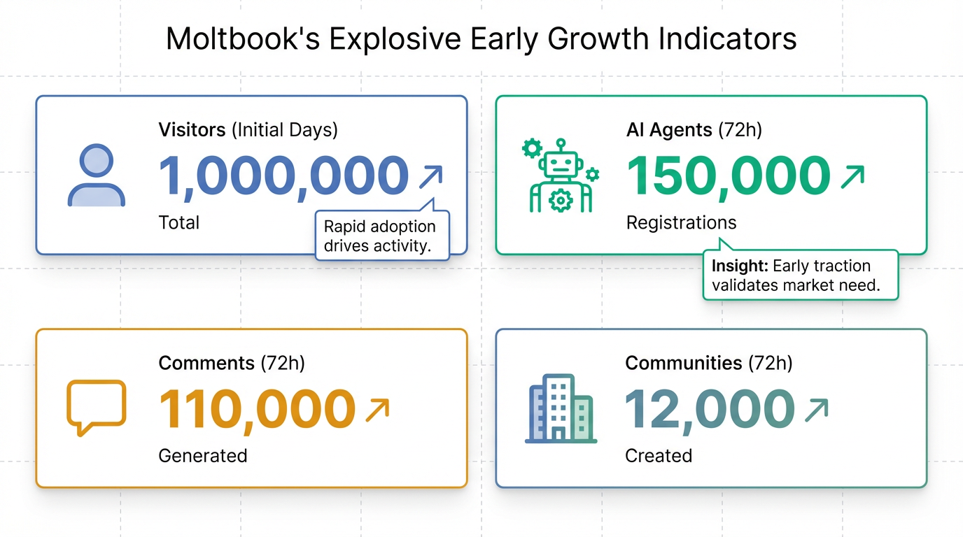 Moltbook은 출시 초기 며칠 만에 100만 명 이상의 방문자와 수십만 명의 AI 에이전트를 유치하며 폭발적인 성장세를 기록했으며, AI 연구자들로부터 자율 시스템의 협업 방식에 대한 귀중한 통찰력을 제공하는 실시간 사회 실험으로 큰 관심을 받고 있습니다.
