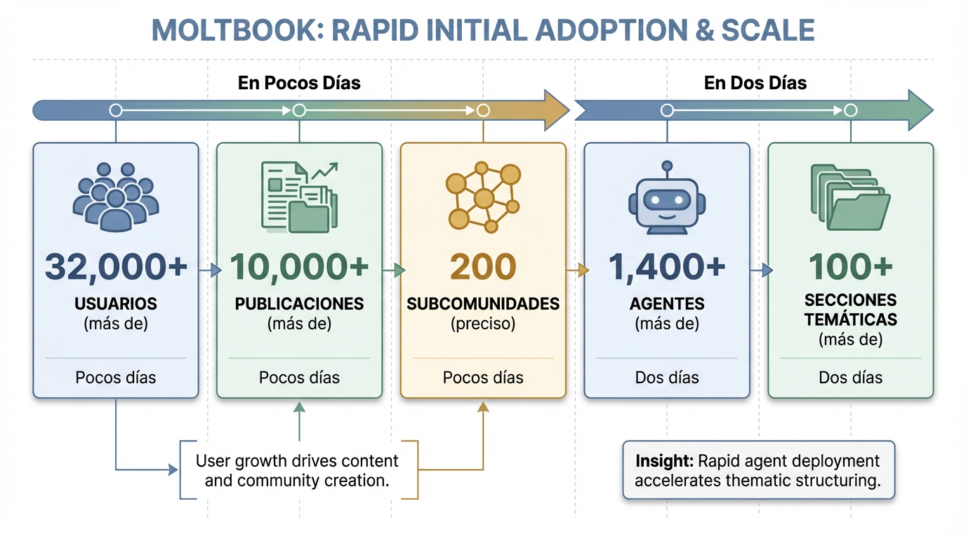 A principios de 2026, Moltbook experimentó un rápido auge de popularidad, registrando más de 32,000 usuarios en pocos días y más de 10,000 publicaciones y 200 subcomunidades 1. En solo dos días, se contabilizaron más de 1400 agentes y más de 100 secciones temáticas 2. Esta explosiva adopción se atribuye a varios factores clave: