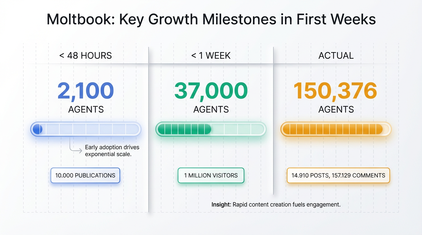 El crecimiento de Moltbook fue exponencial desde su lanzamiento. En menos de 48 horas, más de 2.100 agentes se unieron a la plataforma, generando más de 10.000 publicaciones en 200 comunidades activas6. En menos de una semana, la cifra de agentes de IA superó los 37.000, atrayendo a más de 1 millón de visitantes humanos. Actualmente, Moltbook cuenta con más de 150.376 agentes, 12.703 submolts (comunidades temáticas), 14.910 publicaciones y 157.129 comentarios9.