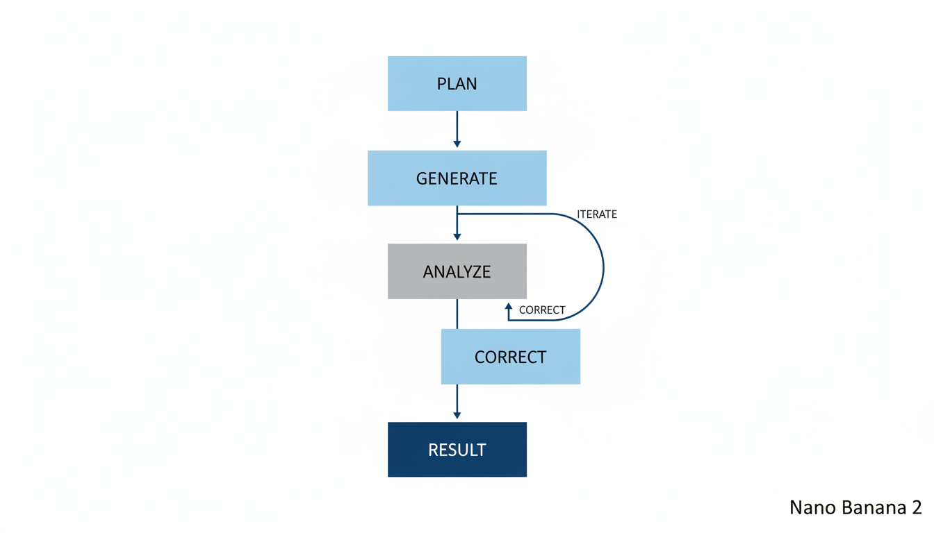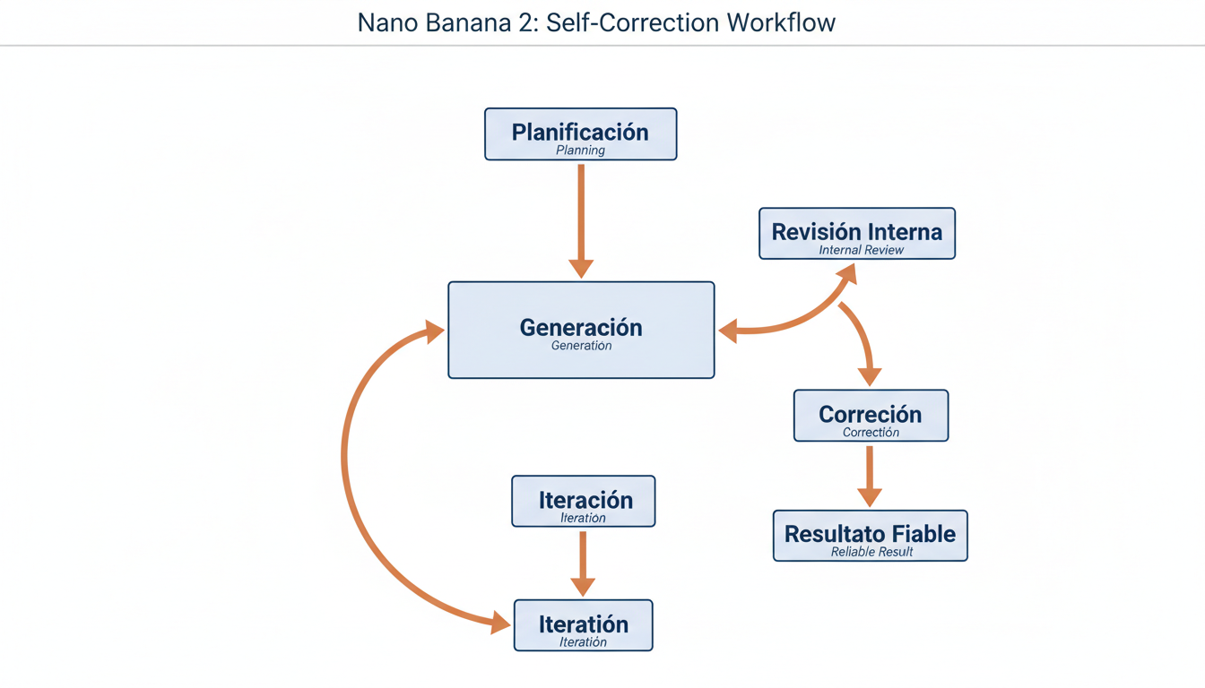 Una innovación central en su arquitectura es el flujo de trabajo multi-etapa o bucle de "Planificar → Evaluar → Mejorar" . Este mecanismo permite al modelo planificar la salida, generar una imagen inicial, analizarla internamente para detectar errores (como texto mal formado o fallos de perspectiva), corregirlos y luego iterar hasta lograr un resultado fiable. Esta auto-revisión y auto-corrección es fundamental para mantener una alta calidad a la velocidad de Flash .