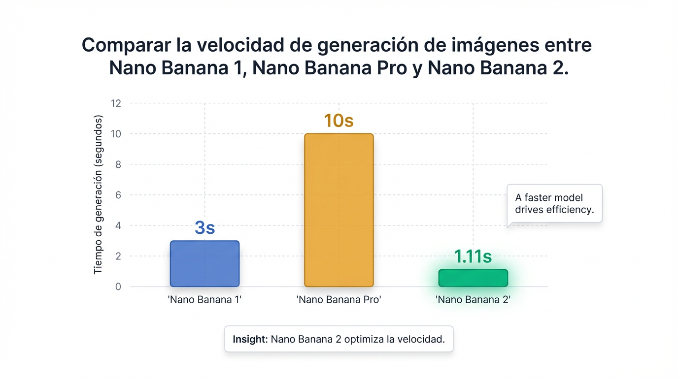 Nano Banana 2 redefine el equilibrio entre rapidez y fidelidad visual, entregando imágenes fotorrealistas altamente detalladas a una velocidad ultrarrápida . Su arquitectura basada en Gemini 3.1 Flash le confiere una velocidad de inferencia excepcionalmente alta y un bajo costo, ideal para interacciones en tiempo real y el procesamiento masivo de imágenes . En las pruebas iniciales, el modelo ha demostrado la capacidad de generar imágenes complejas en menos de 10 segundos, con la expectativa de reducir este tiempo a "pocos segundos" una vez optimizado, e incluso ~1.11 segundos para imágenes de 512x512 píxeles .