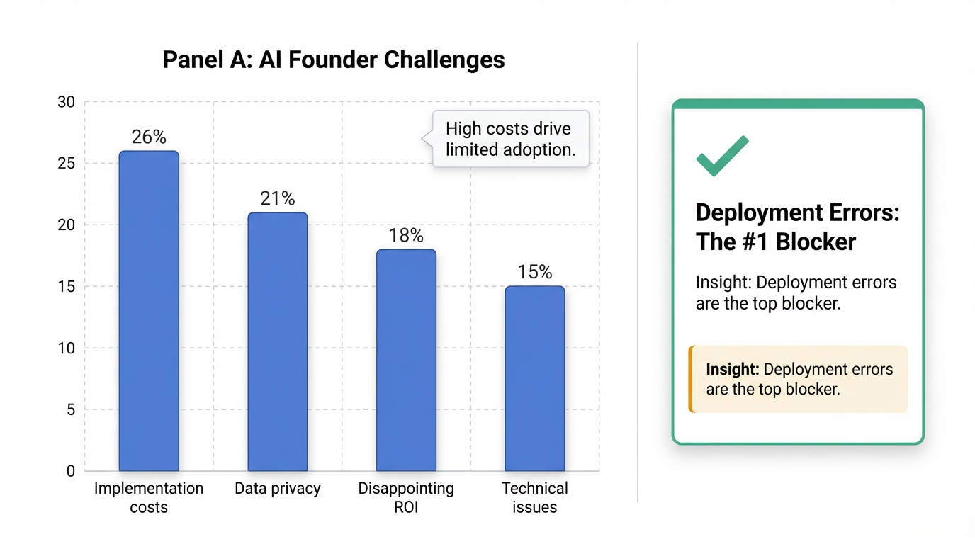 However, embracing AI is not without its unique set of challenges. Solo AI founders frequently encounter deployment errors, with code that functions locally often failing in production due to security protocols or infrastructure constraints 8. Other significant hurdles include database issues, high implementation costs, data privacy concerns, and the notorious "hallucinations" of large language models, which can undermine reliability 9. These issues highlight the critical need for human judgment and strategic oversight, as AI, while powerful, cannot replace human creativity or ethical decision-making 10. Founders must adapt to new demands like prompt engineering and diligent system monitoring, balancing efficiency with the risk of dependence or perceived loss of authenticity 11.