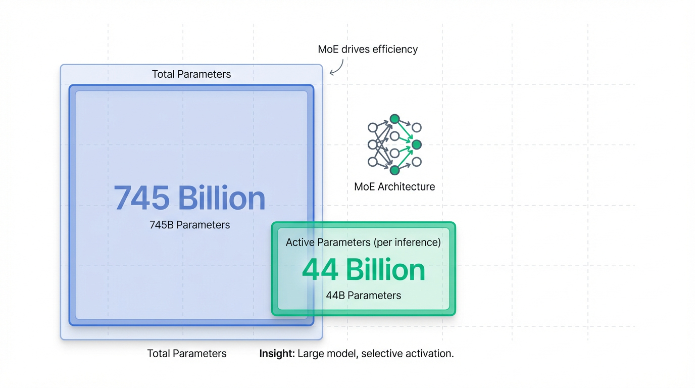 At its core, GLM-5 leverages an advanced Mixture-of-Experts (MoE) architecture, boasting approximately 745 billion total parameters 5. Crucially, it achieves efficient processing by utilizing only 44 billion active parameters per inference 1. This design also incorporates DeepSeek's sparse attention mechanism (DSA) to facilitate efficient handling of long contexts 1.
