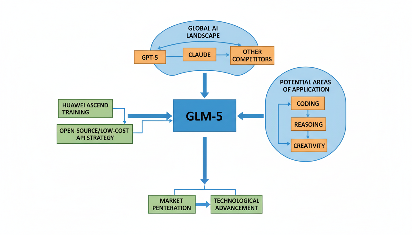 A pivotal strategic development is GLM-5's training infrastructure. The model was trained entirely on Huawei Ascend chips using the MindSpore framework, signifying a deliberate move towards greater independence from US-manufactured hardware 1. This strategic choice underscores Zhipu AI's commitment to building a sovereign AI ecosystem. Zhipu AI also maintains a history of open-sourcing its models, and GLM-5 is anticipated to follow this trend, potentially under an MIT license, making its technology more accessible 1. Additionally, its API pricing is expected to be ultra-low, projected around $0.11 per million tokens, aiming to offer a cost-effective solution in the competitive AI landscape 1.