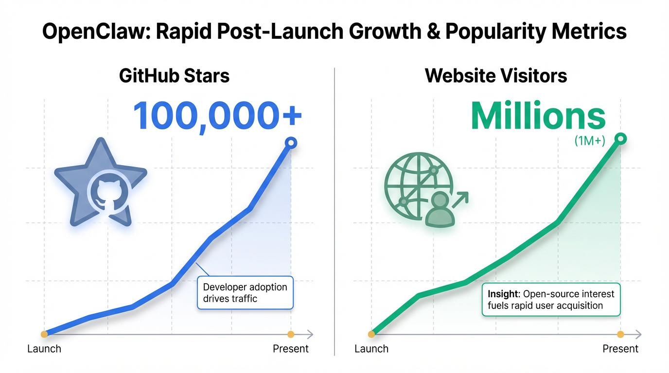 The project quickly gained significant traction following its launch, accumulating over 100,000 GitHub stars and attracting millions of website visitors within weeks, underscoring its rapid popularity and strong community interest 2.