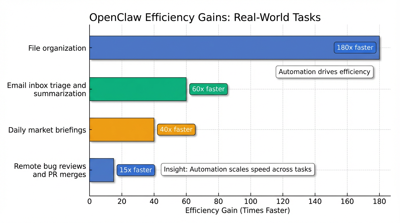 OpenClaw's impact is further highlighted by the significant efficiency gains reported by users. These improvements underscore its ability to act as a "true digital employee or assistant," retaining long-term memory of user preferences and proactively managing tasks 9.
