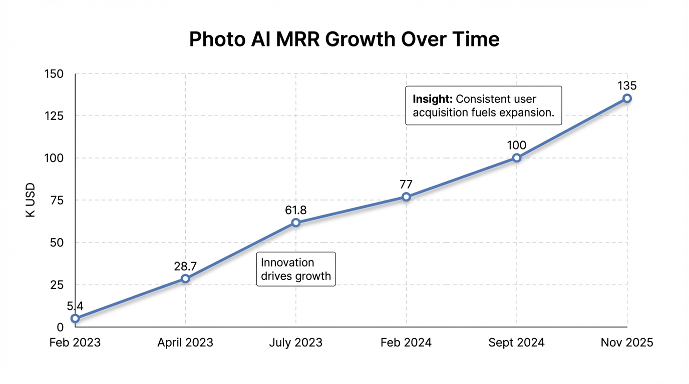 The product's revenue and growth trajectory has been nothing short of meteoric and fully verified. Starting with an impressive ~$5.4K MRR in its first week (February 2023), Photo AI swiftly scaled to $28.7K MRR by April 2023, and then to $61.8K MRR by July 2023 8. Its momentum continued, reaching $77K MRR by February 2024 and exceeding $100K MRR by September 2024 8. As of November 2025, the product sustains an MRR of $132-138K, translating to an annual run rate of $1.6-1.65M and an estimated total revenue to date exceeding $2M 8.